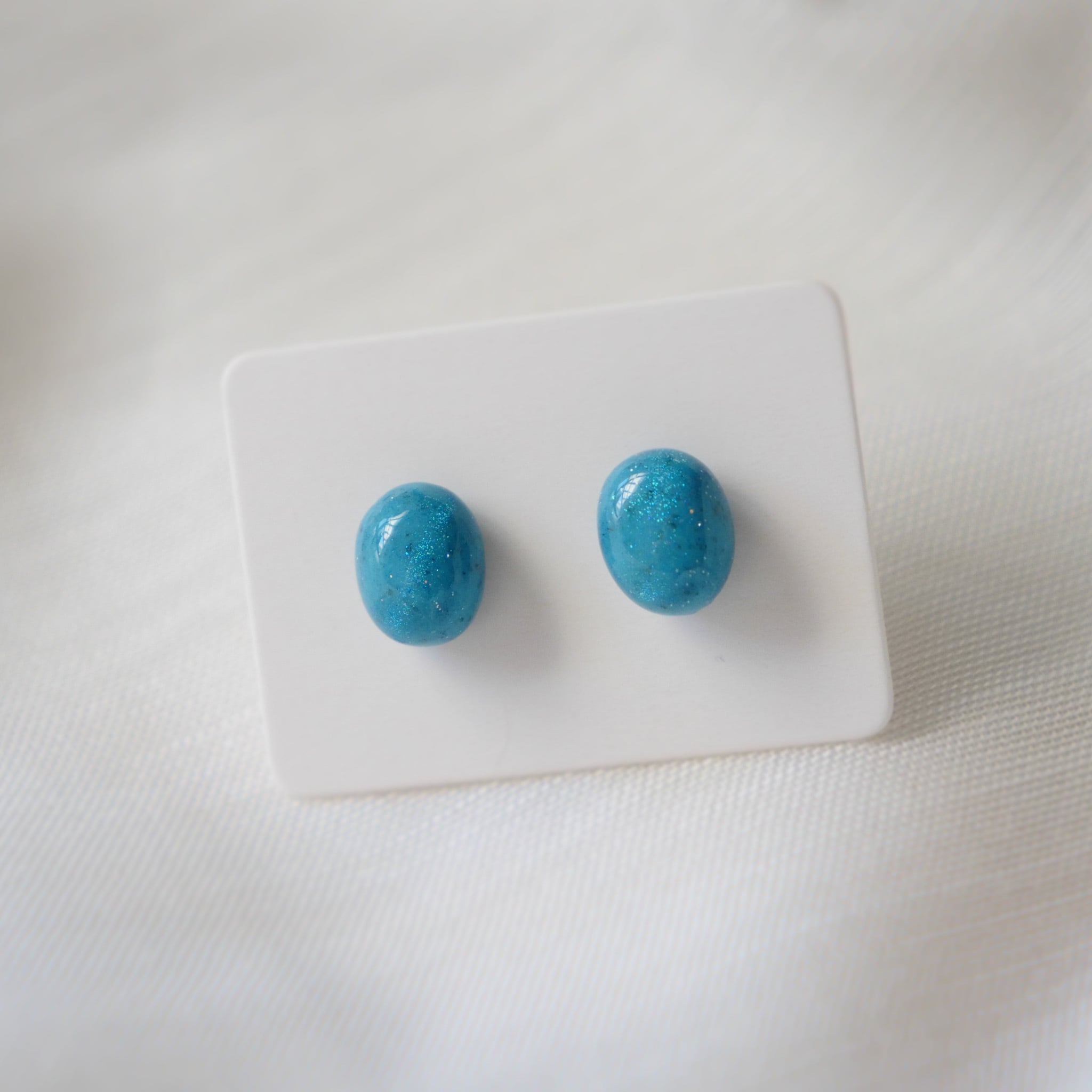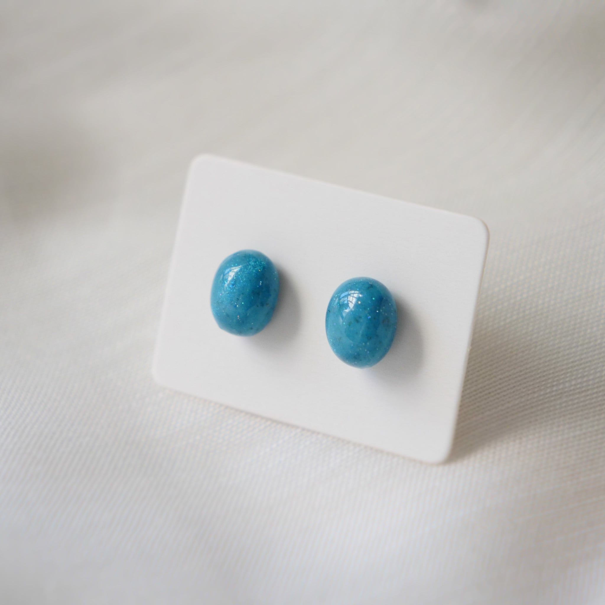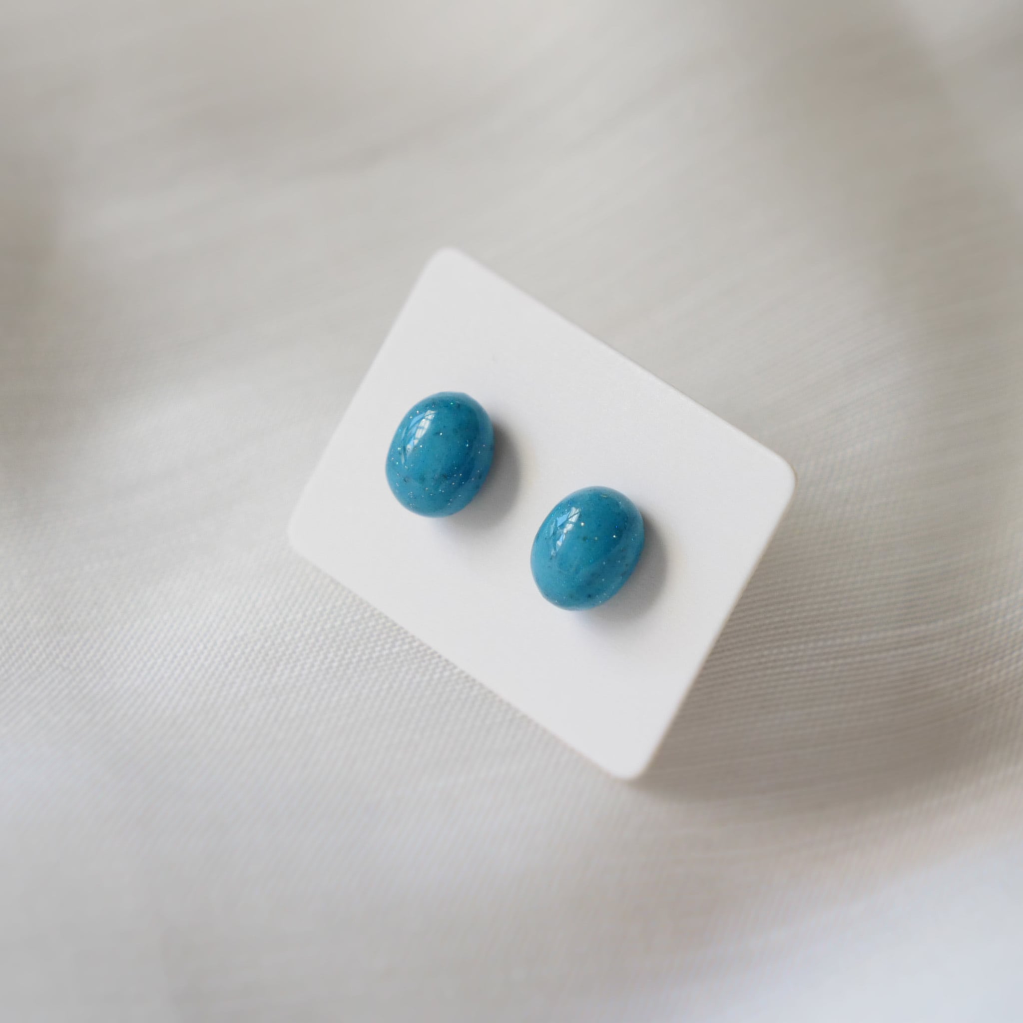 美しいターコイズカラーで、卵形をした両耳ピアスです。